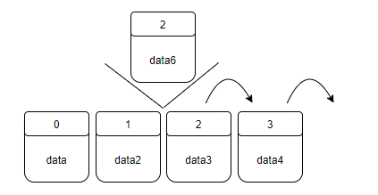 데이터의 index 삽입은 ArrayList에서 좋은 성능을 기대하기 힘듭니다. 위의 그림과 같이 특정 index에 삽입되게 되면 뒤에 있는 요소들을 하나씩 뒤로 이동시켜 주는 작업이 추가되기에 O(n)의 시간복잡도를 가지게 됩니다.