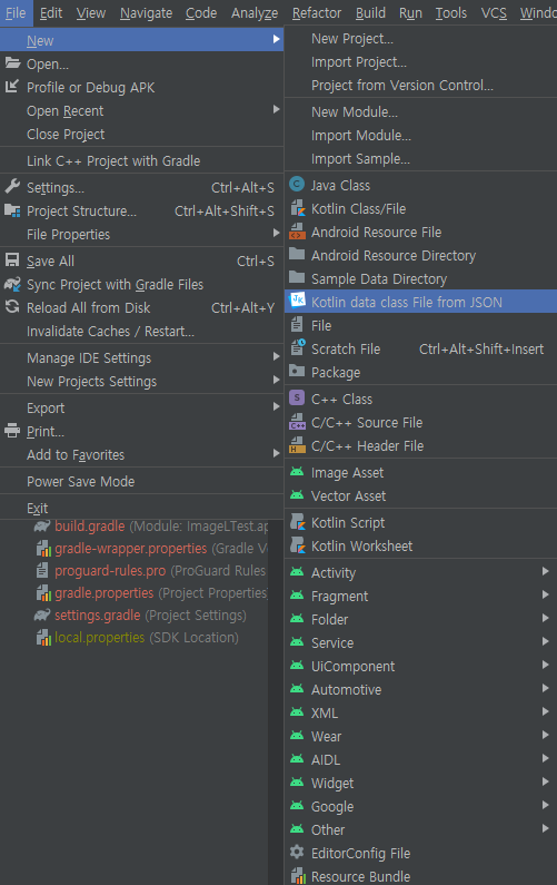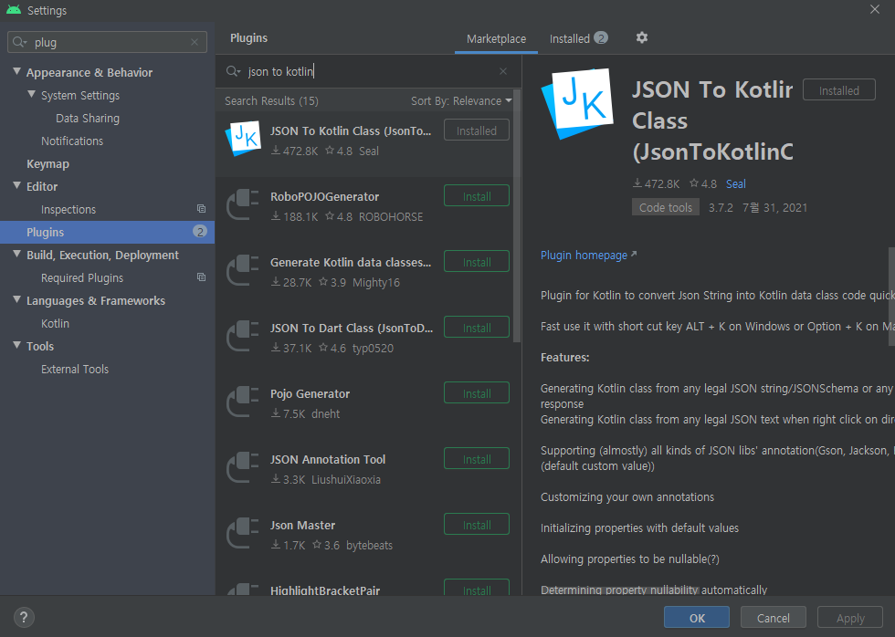 우선 위의 JSON To Kotlin Class 플러그인을 설치합니다.
