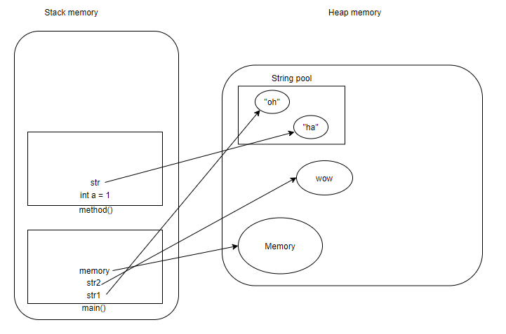 2. str1 = "oh" 문자열이 생성되어 힙 공간 의 String pool 영역에 들어갑니다.