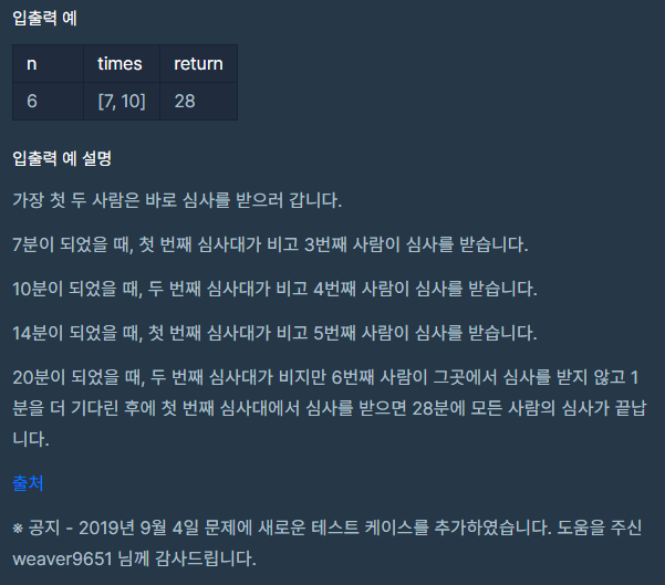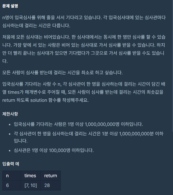주어진 n명의 사람이 주어진 times 배열의 시간을 활용하여 최단시간내에 입국심사를 받으면 되는 문제다.